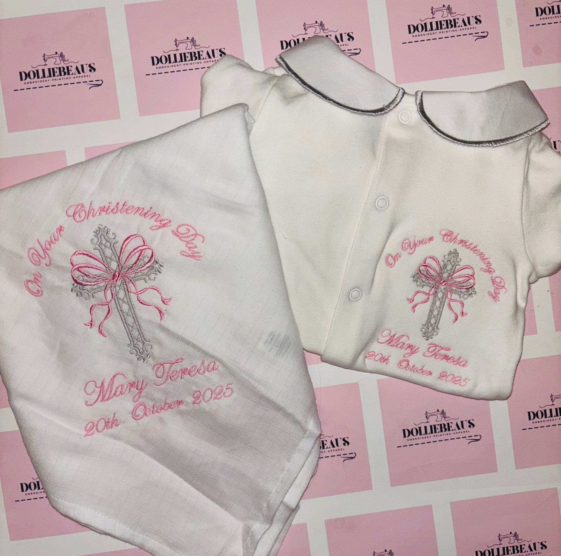 Stunning 4pc christening/baptism sets comes with collared babygrow, white shawl, muslin & bib!